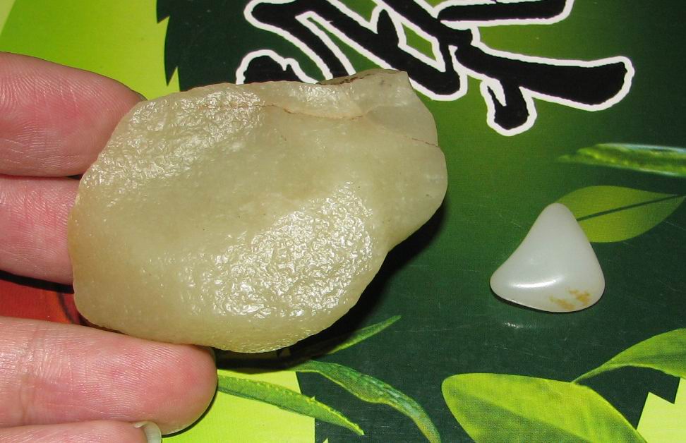 本周淘到一块颜色很正的黄口戈壁玉。色作浅黄。一点不偏绿,有大风吹的黑皮色。最后一图所示,背面圈内有一些花点。