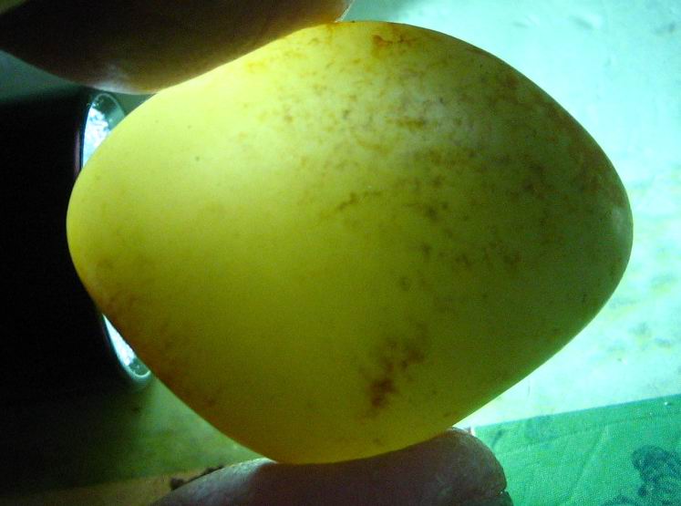 好形,油烟皮 ,有道小裂,裂内满沁皮,一沁到底。肉很细,颜色稍微有点闷。