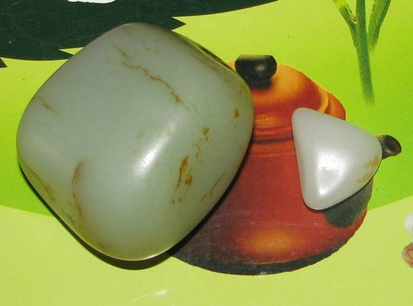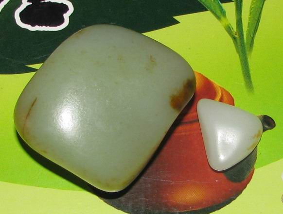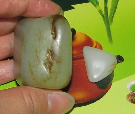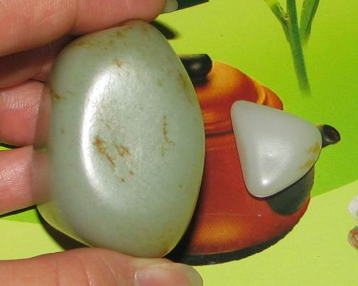 尺寸 48-45-25mm肉细,形状饱满规则,色青白偏白,肉质无结构,是很不错的青白玉玩料。挂黄和浅红色皮,有小裂如图一二,不影响结构。