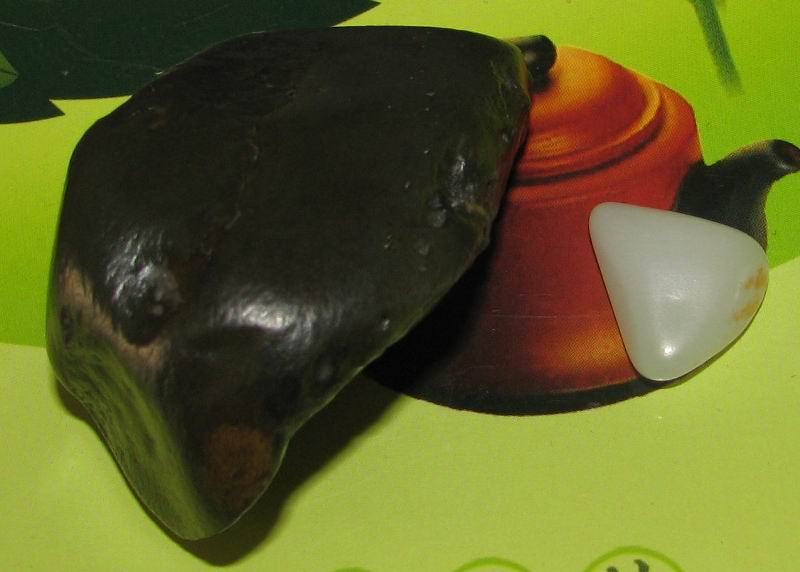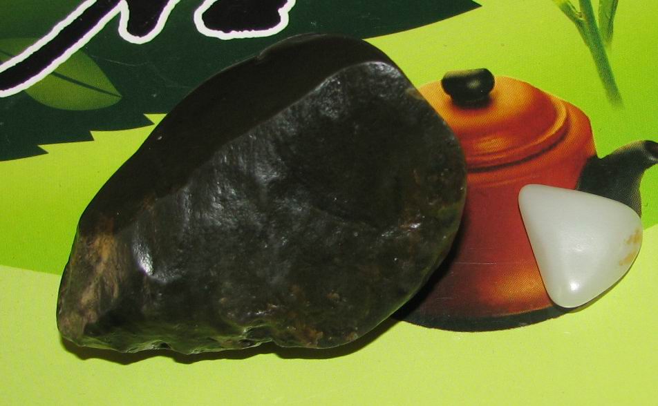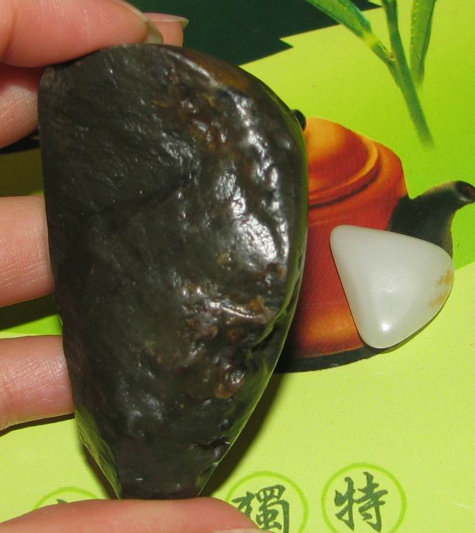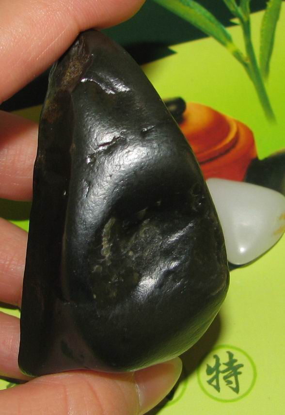 尺寸 60-39-35油润,肉质细腻,直闪石,黑度稍淡。这块料子肉也很细,基本不透光。但是表面有些撞击坑,不算玩料,好在块度较大,没有影响结构的伤裂花绵,所以做为做料还是非常合适的。表面稍有土红皮,如图所示。因为不是玩料,就不给以前订黑青戈壁玉的朋友做特别推荐了,想做加工的玉友可以选择这块。