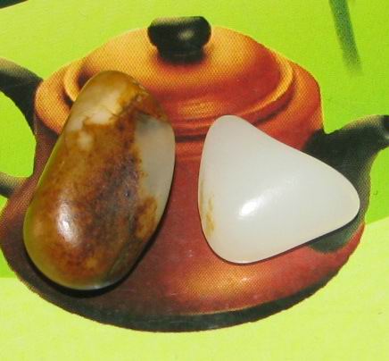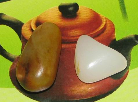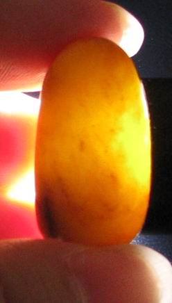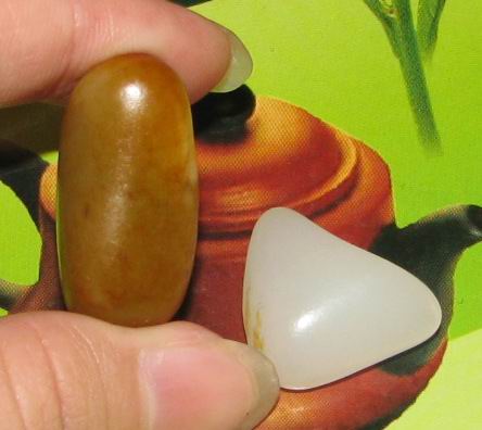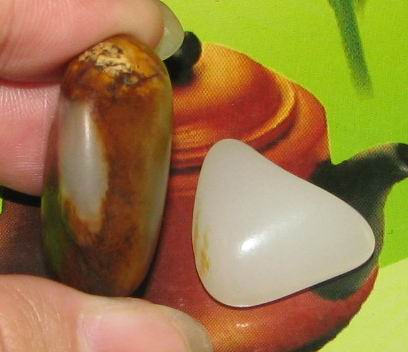 肉细,形状好,露一点羊脂肉。稍挂石根,皮色下大部分透光,肉质细腻,如图。
