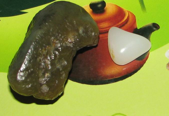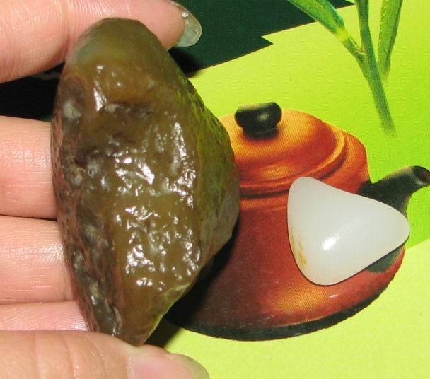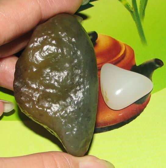 尺寸 50-33-30mm带糖,底质青白玉,还有青花墨点。是不错的戈壁玉标本哦。