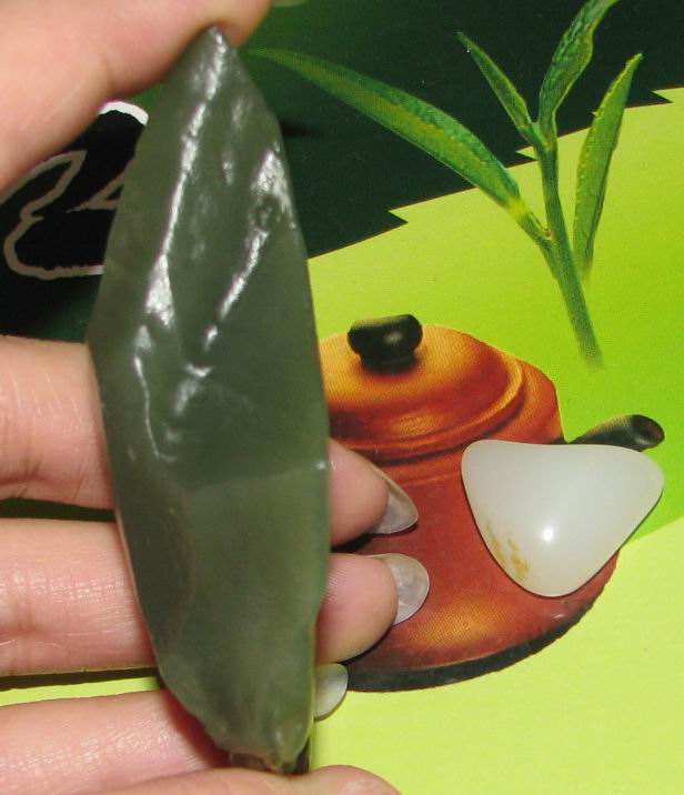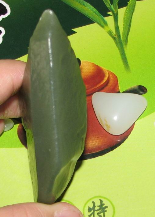尺寸 70-37-20mm肉超细,质感油润,没有结构。是很漂亮的青玉哦!底部有小石花算是瑕疵。块度较厚,做活很漂亮。