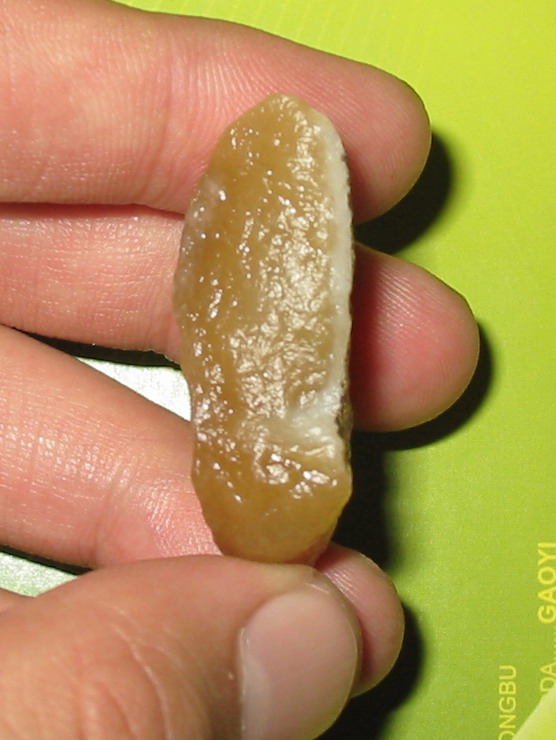 肉质细腻,干净,油润,形状好,打眼可直接带。采购员一个半月就找到这么一块玩料标准的,戈壁料中糖色的少见,干净的尤其少,鲜艳的更少了。另外这块料子的黑皮也很有特色。