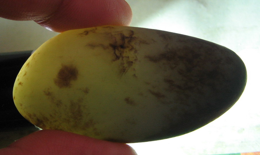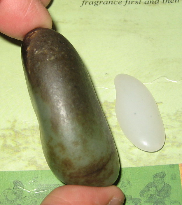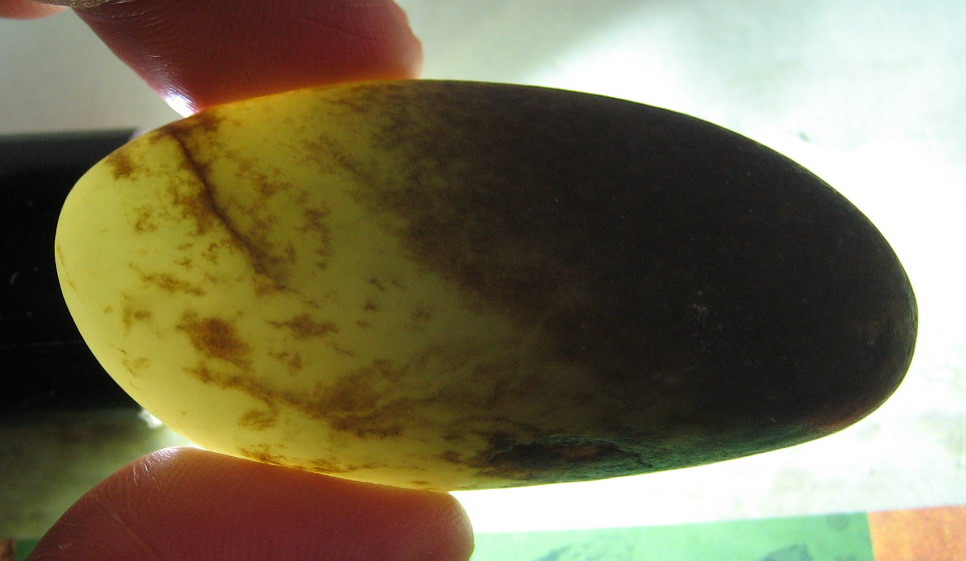 尺寸 57x30x22mm 形状好,基本一口气,小手把件籽,聚黑皮,颜色为青玉,不闷,侧面稍有小绺,肉质细,打灯稍有结构。黑皮最重处稍有石性,另外料子为新料子,表面有土灰,玉友上手后需盘玩。