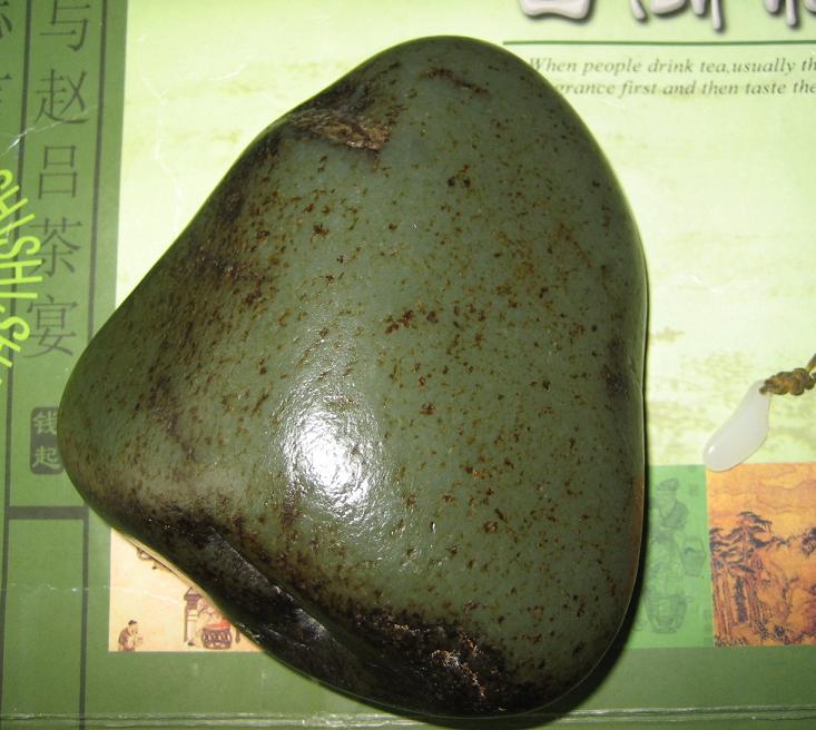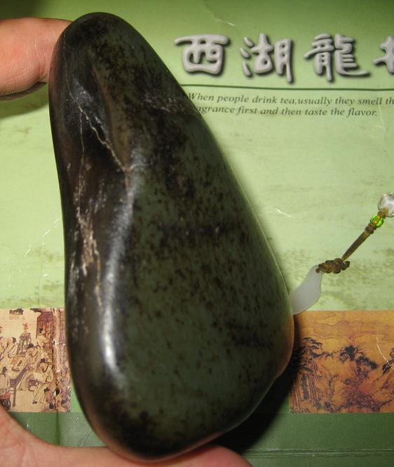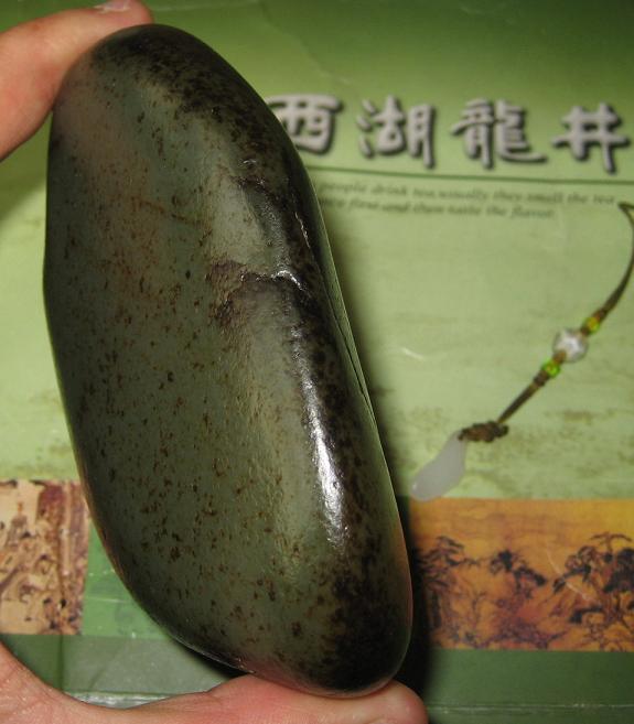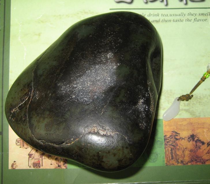 尺寸 115-104-52mm 通体老结黑皮,稍盘即油,肉质细腻,干净,打灯稍有结构,颜色为青,偏深,块头大,形状好,是天然的摆件,背部有老沁皮裂,裂稍大,背后有石礓皮。整体是个天然的摆件,加个底座即可。
