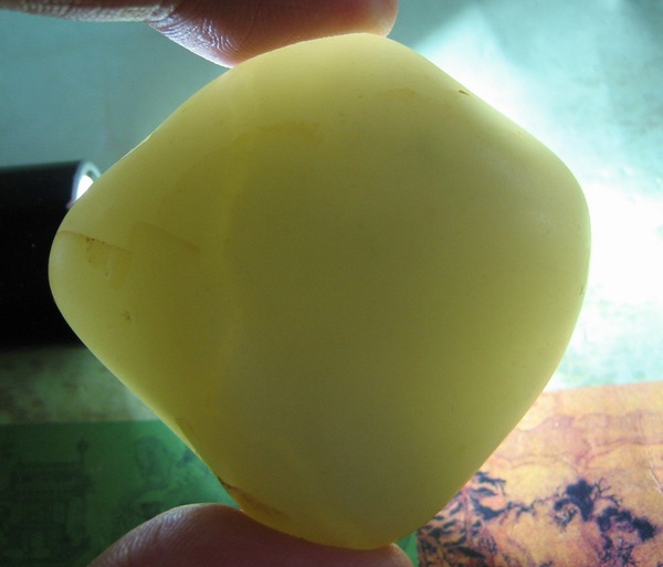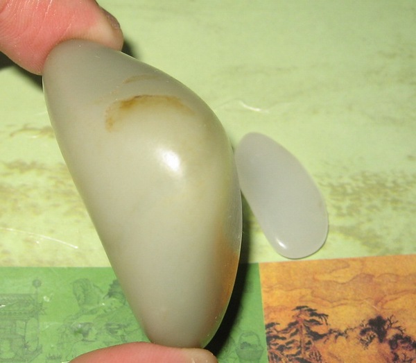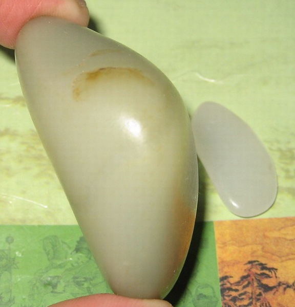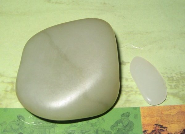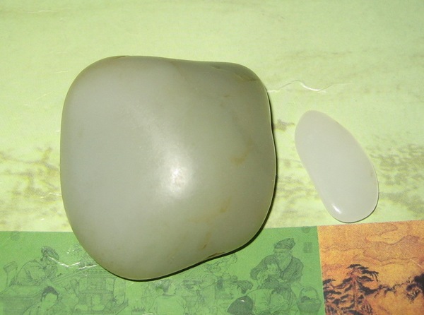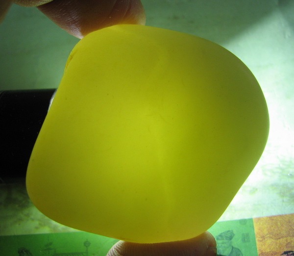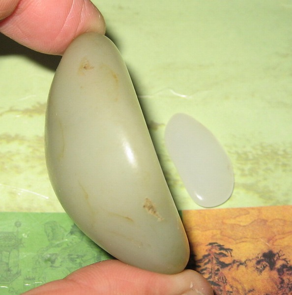 小,稍盘即很油润,料身上有水线,打灯看肉质特别细腻,用手电筒侧向打光基本看不到结构。干净,玉质颜色为青白,这块料子的密度特别好,是很好做料。