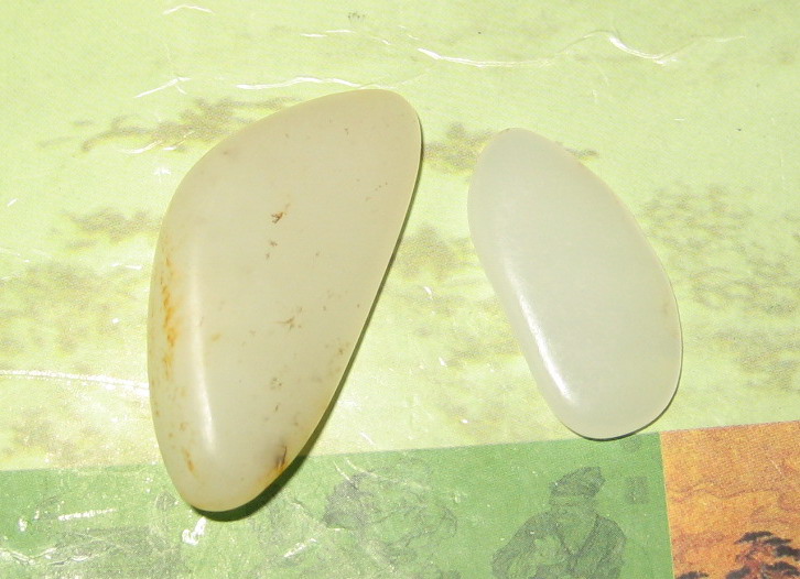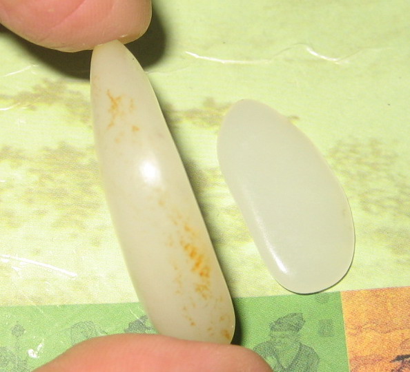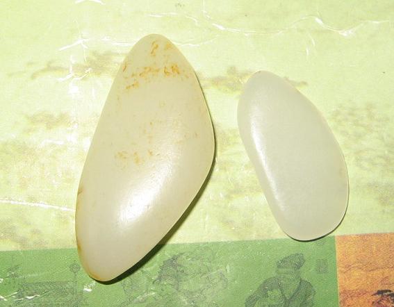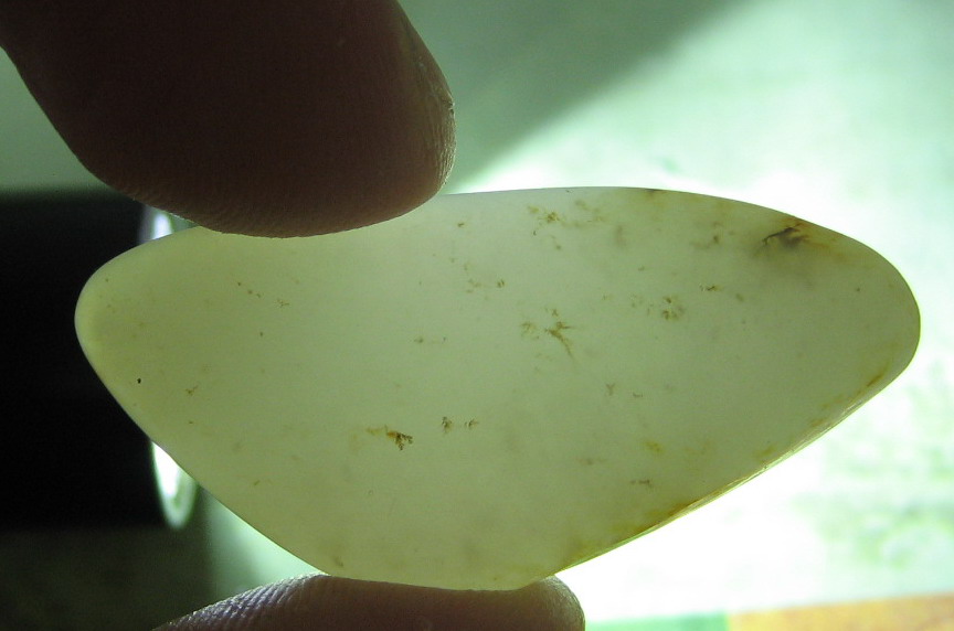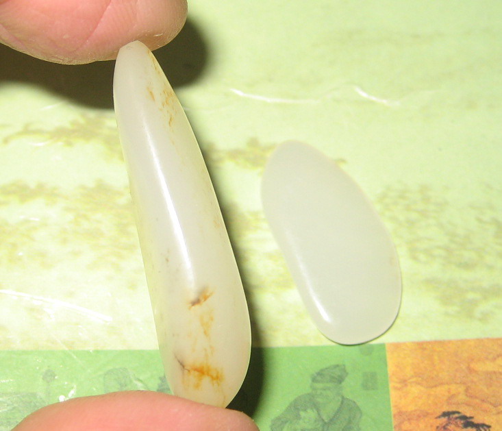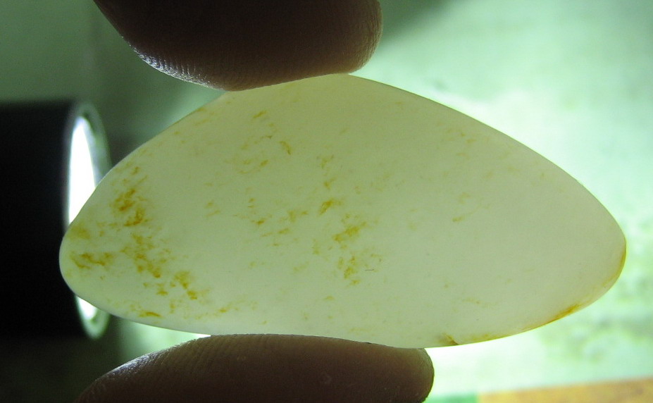 尺寸 34-18-9mm 原籽,背部有轻微抛光和修形(收来时据维族朋友说原来背部有礓,难看的很,去掉了),籽形为水滴状,基本无裂伤,正面和侧面大部沁洒金皮,为真皮,无二上,皮色自然光下为金黄色,很是漂亮,背部局部沁褐皮,可见背部照片。打灯看肉质细腻,密度特别好,基本无结构,在手中盘玩时油润感很强。玉质颜色为I级白,因金黄皮色的原因,显得很熟糯,给人一种很老成的感觉。综合就肉质,皮色,形状来说是个很不错的精品挂件籽,可直接包金佩戴。推荐上好工能出小精品。