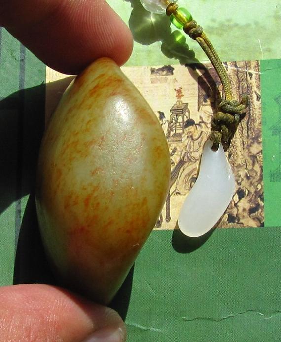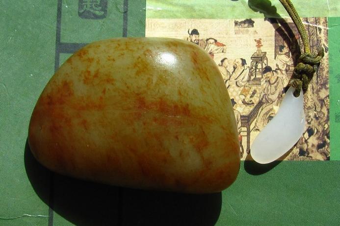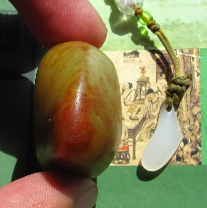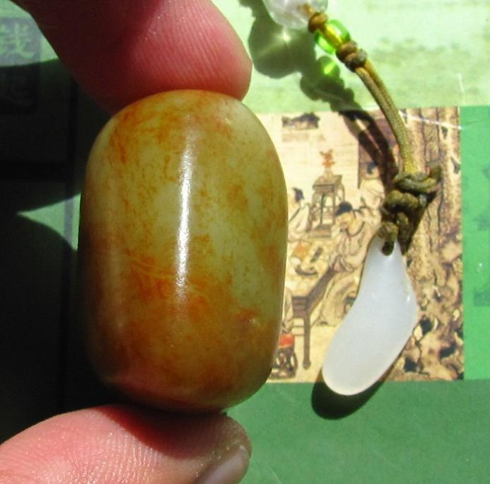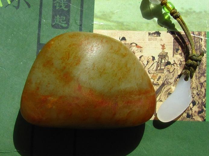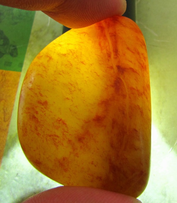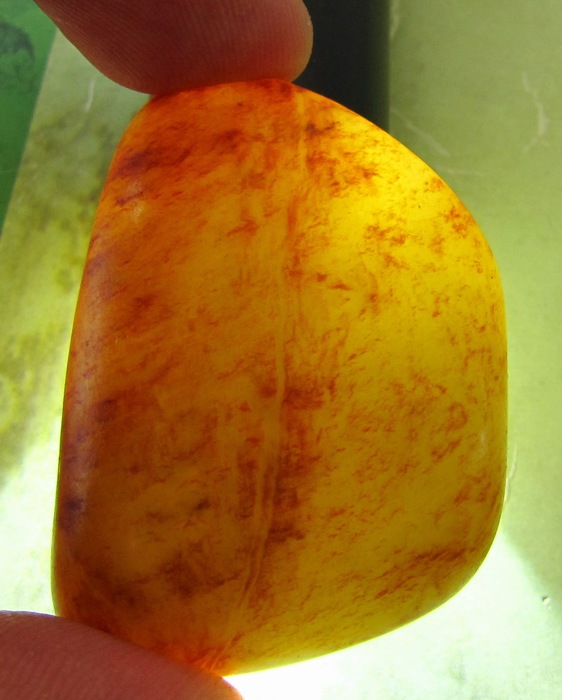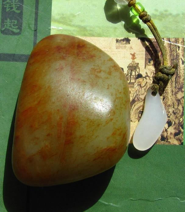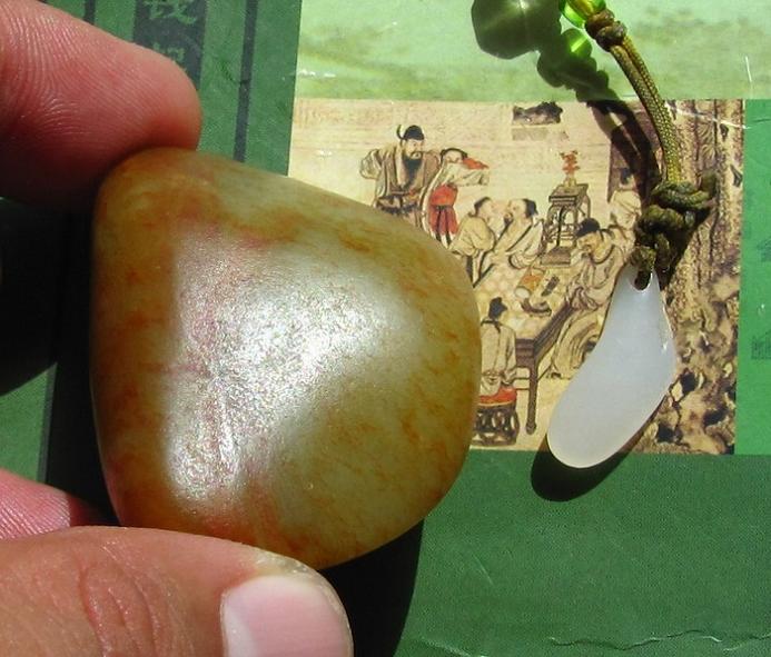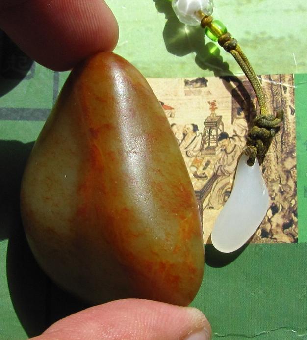 特别温润,拿在手里的感觉就像一团油脂,不用盘都很油。特别细腻,用手电筒侧向打光基本看不到结构。一口气,无大伤裂,满沁鲜艳的红皮,籽中有一道水线从正面贯穿,延伸到背面边缘处,表面毛孔细小,玉友可仔细看反光图,真皮色稍微有点凹陷,水线部分硬度和玉石不一样,和周围的平面稍有不同。整体是个红皮子玩料,料子是新料,盘玩后效果更好,红皮会越盘越漂亮。