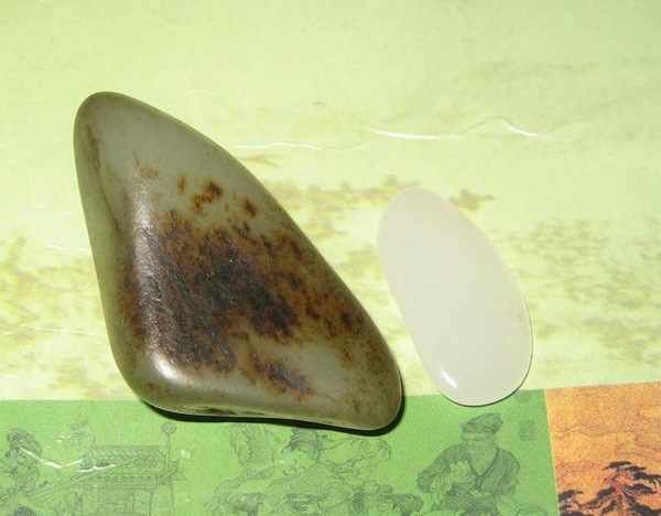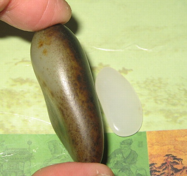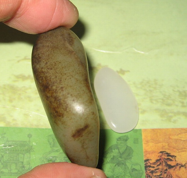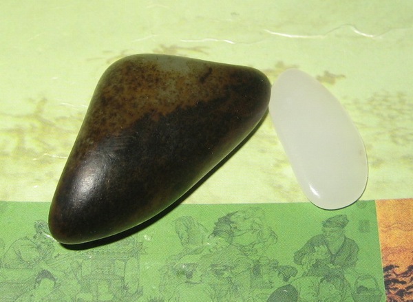很有特点的料子,籽身大部被皮色覆盖,正面皮色较深为褐黑色,背部为褐黄色,很是漂亮,以上皮色均为真皮,无二上,稍微盘玩即很油润,典型的油皮料子,底质为肉质颜色为青白,肉细,密度好,无结构,整体基本无大的裂伤,就肉质和皮色来说可直接把玩亦可利用皮色巧雕做活。
