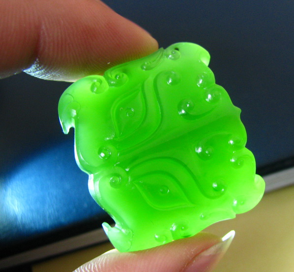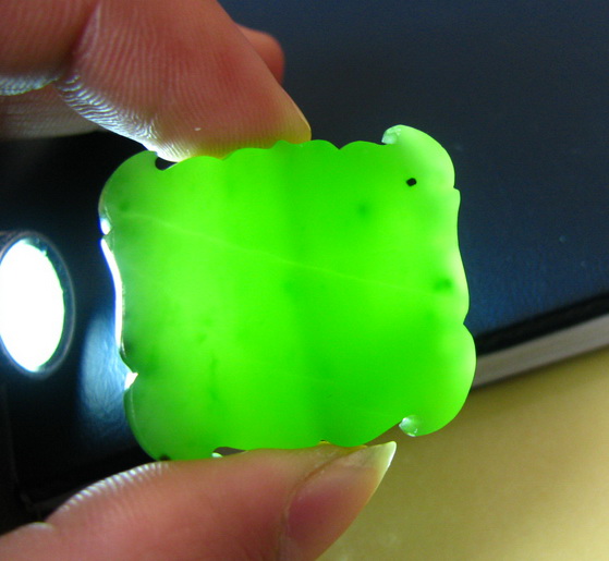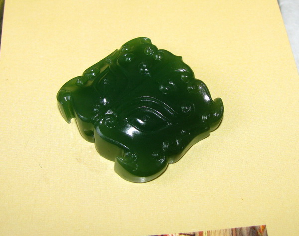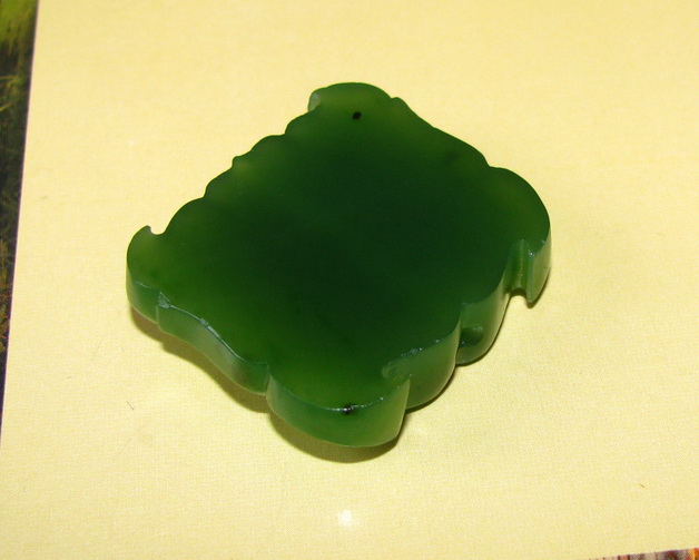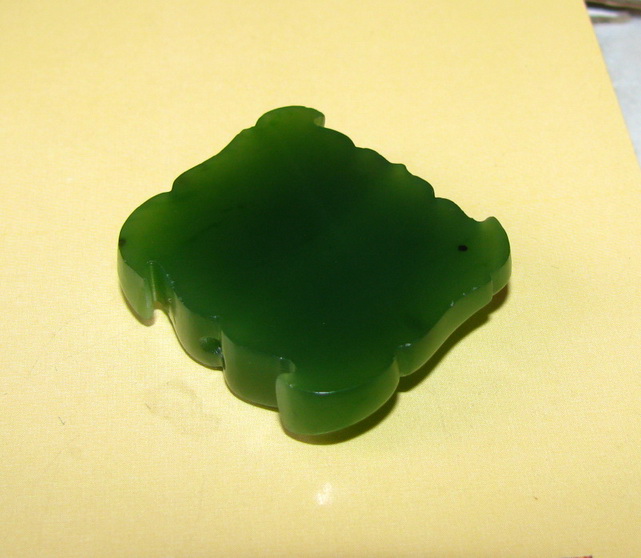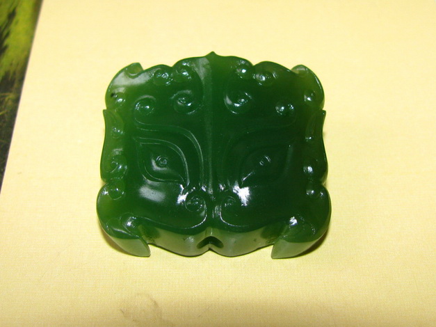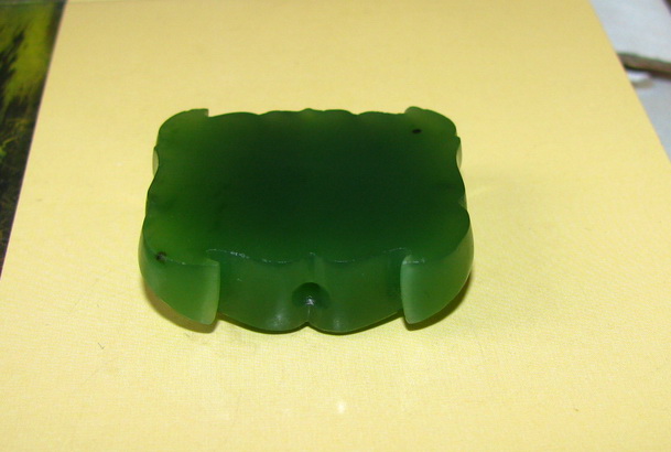 品质:和田玉俄碧玉尺寸:33-29-10mm说明:肉质细腻,色泽十分均匀,是鲜艳的嫩绿色,如图保留有三个碧玉特征的黑点,背面微有两道纹线,虎面面相威武,线条犀利,苏工。