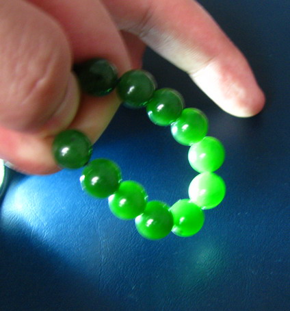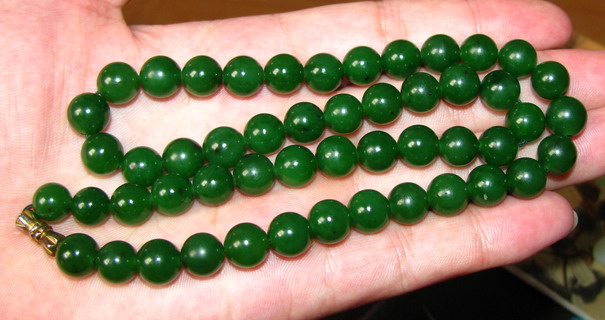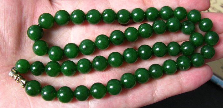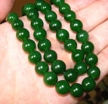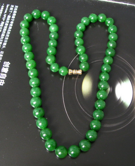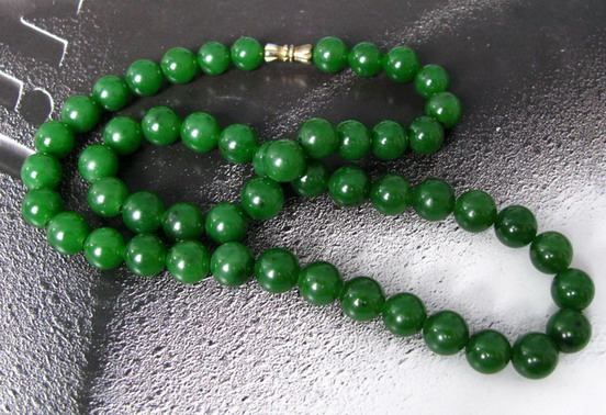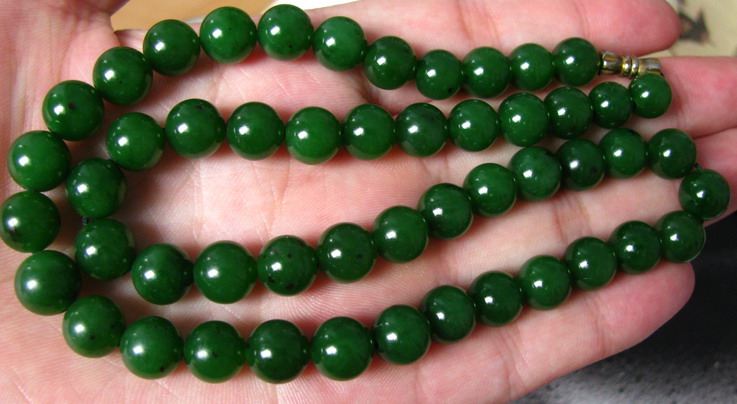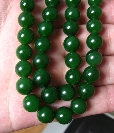 品质:和田玉俄碧玉尺寸:9mm说明:珠子圆润,肉质细腻,油润,色泽浓绿鲜艳,色泽均匀,有碧玉特征的黑点,颜色很绿。