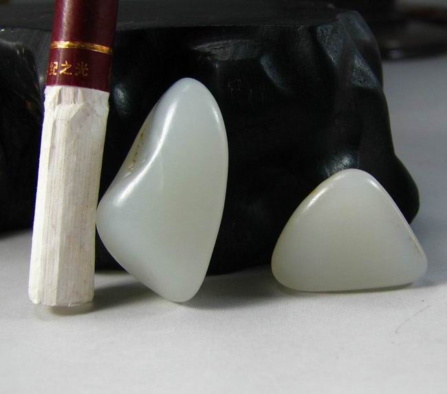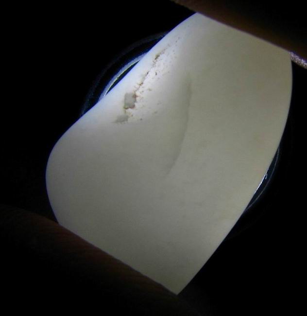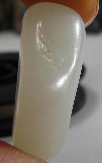 说明:白度为I级以上,类似水滴状的籽形,很饱满,敦实,表面有两处裂隙如图,不是太完美,但对料子的整体性没有影响,表皮毛孔很细腻,微小,温润感特别好,肉质非常细腻,基本无结构,可到脂白,建议用来做活。