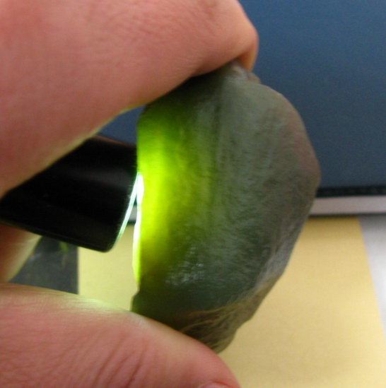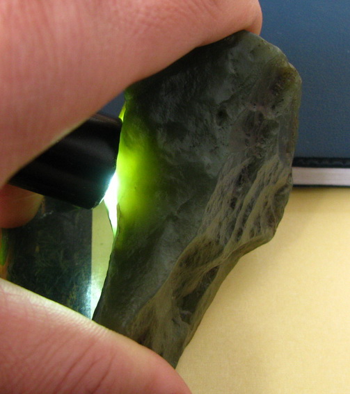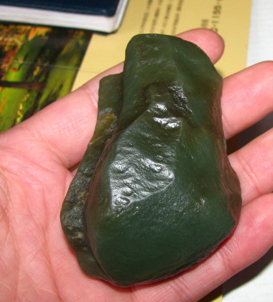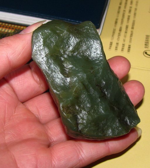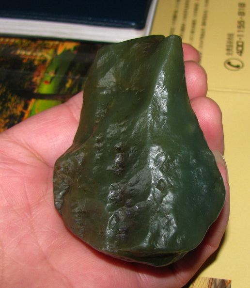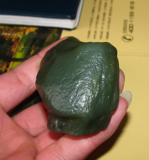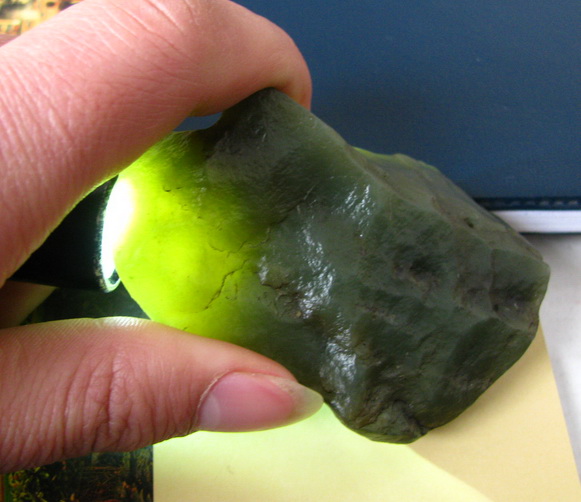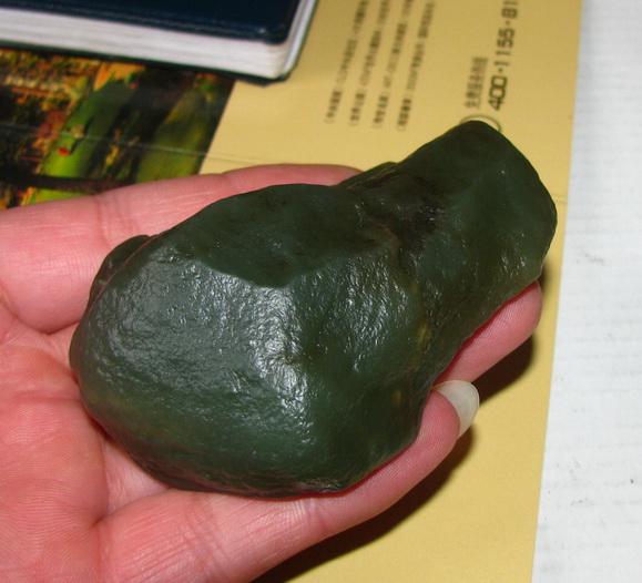 说明:肉质细腻,质地均匀,如图有戈壁玉特征的风吹尘皮,块度大小是个把件,油润性好。