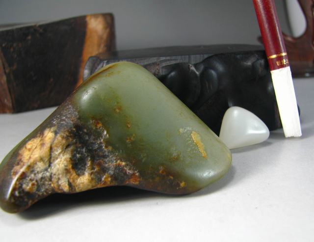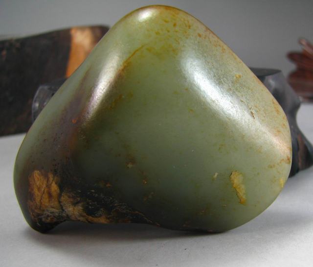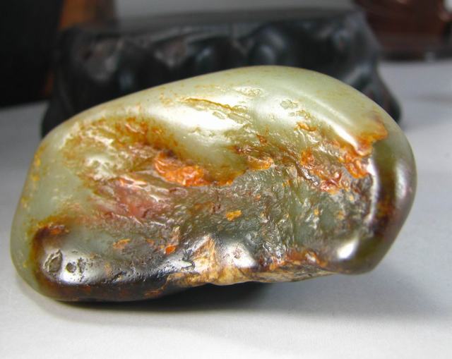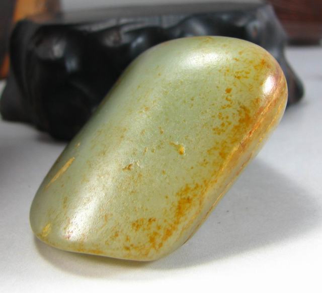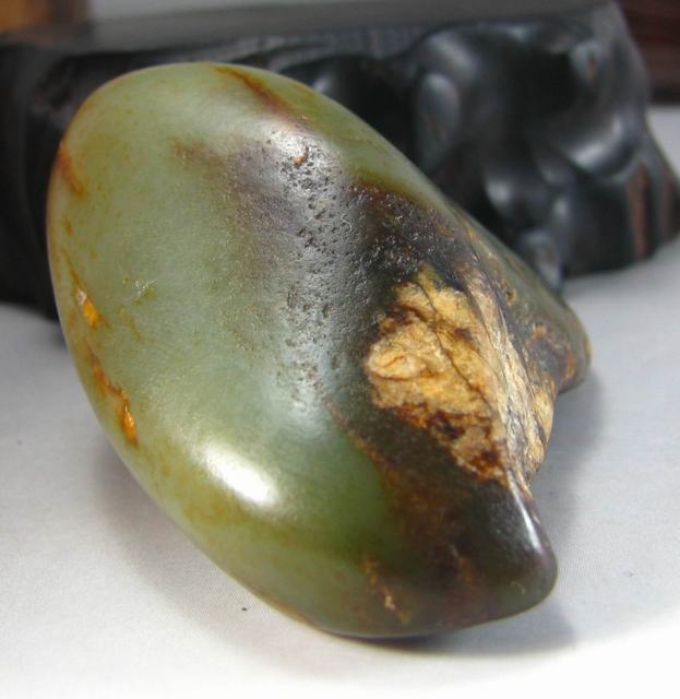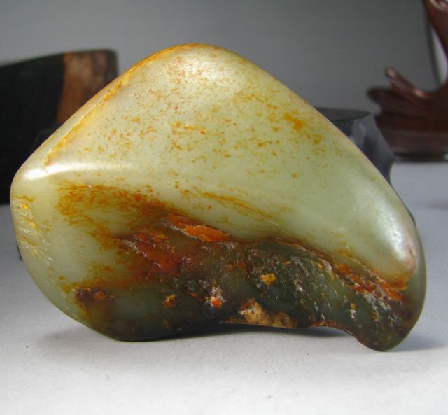 品质:和田玉青白玉籽尺寸:75x55x30mm说明:肉质细腻,侧向打灯基本无结构,熟糯,整体呈一种暖色,此种料子做活白度会提高,籽为残籽,一面肉中有石礓,石礓附近肉中青色稍重,青白肉表面挂淡红皮,红皮为真皮,无二上,此面一端有两道老的沁皮裂,由于是老裂,皮色咬到底,由此可知,裂不深,整体是个细肉熟糯青白做料。