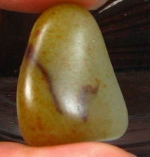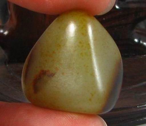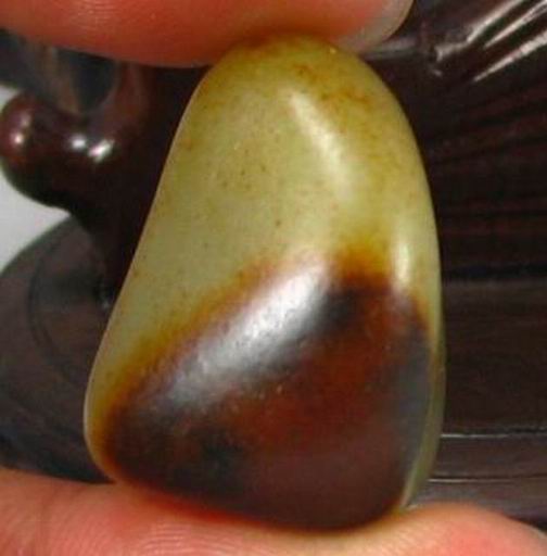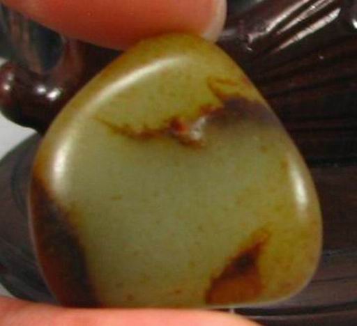 说明:三角状的籽形,饱满,敦实,局部有老裂,不深,满沁褐红皮,皮色老成。顶部红皮聚集,很有特色,适合巧做。青白微偏白的玉质颜色,在皮色的覆盖下显得特别熟糯,把玩时温润感特别好,就是一小油疙瘩,侧向打灯看肉质特别细腻,无结构,是青白料中的小精品。