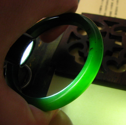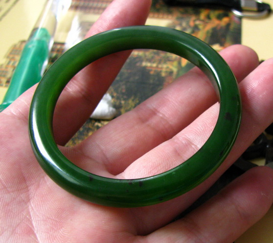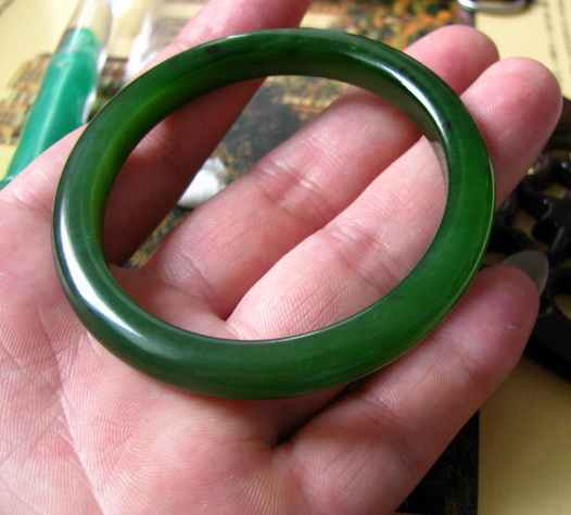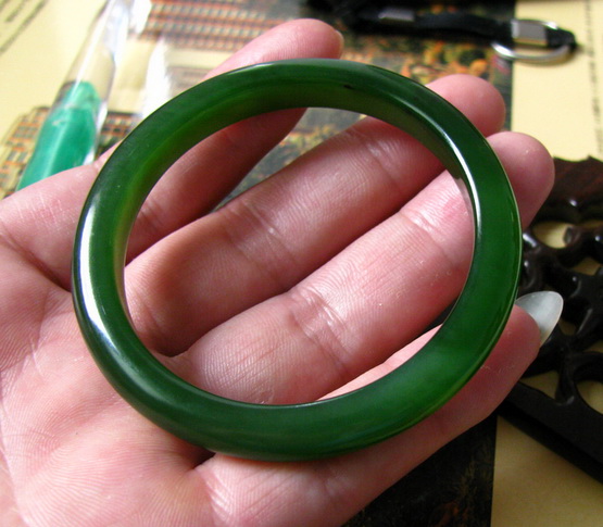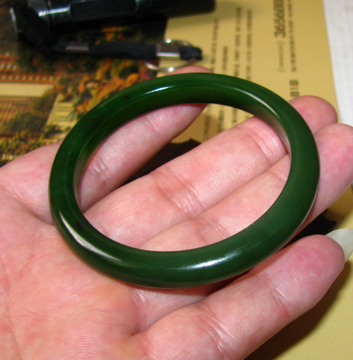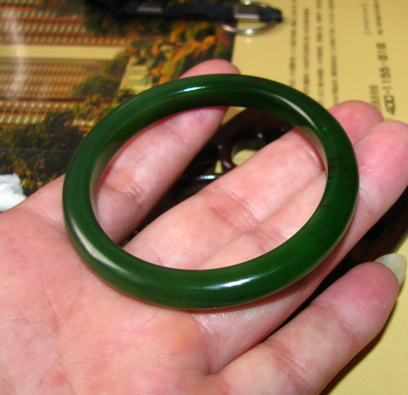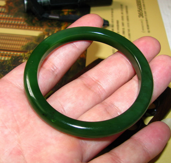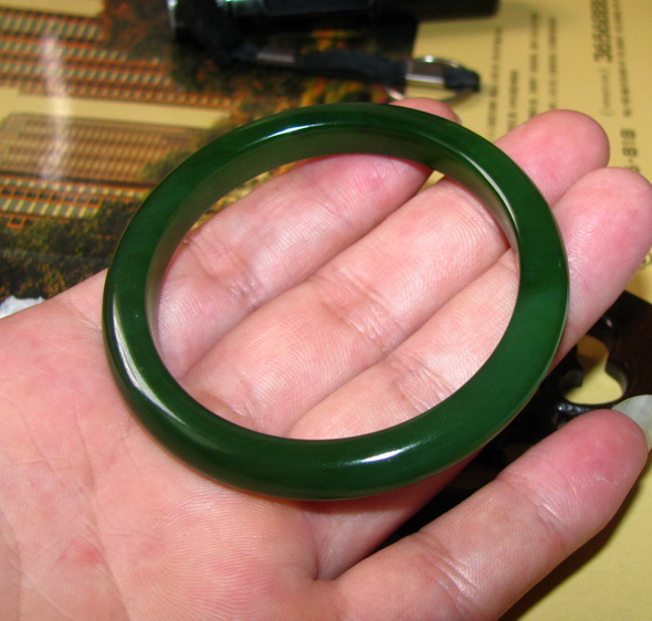 品质:和田玉俄碧玉尺寸:内径53外径67宽8mm说明:这支镯子的水头很好,油润,色泽鲜艳,如图略有碧玉特征的黑点,没有裂,完整。