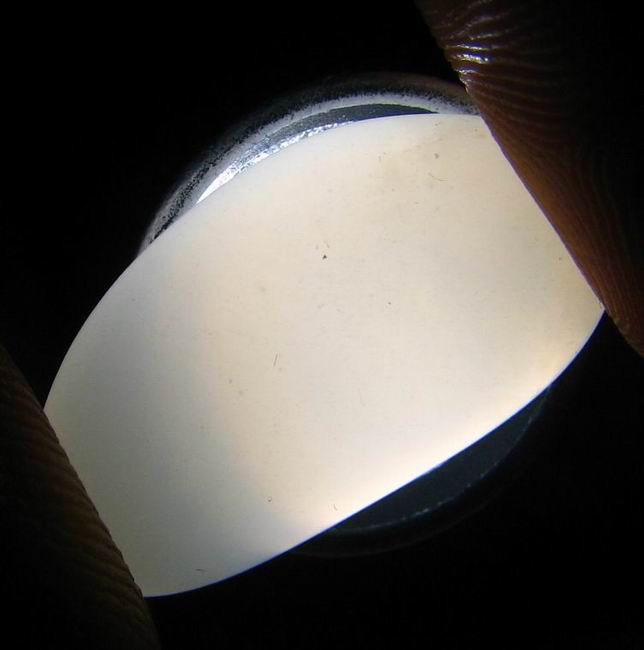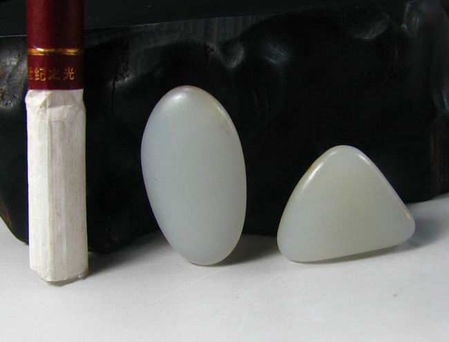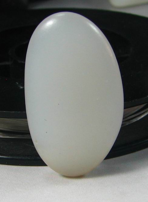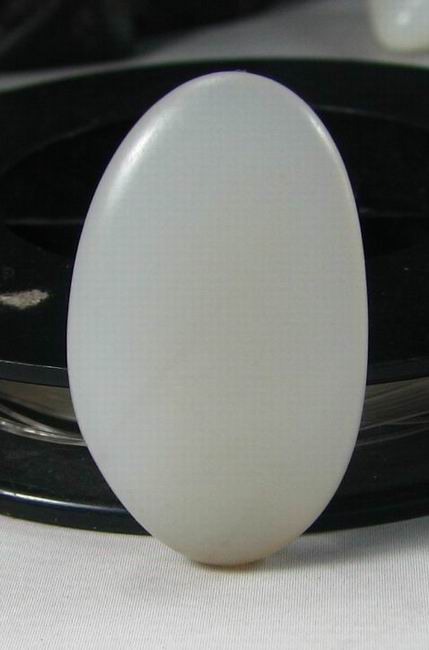 说明:把玩时温润感很好的一块料子,圆牌状籽形,底部有微裂,肉质非常细腻,基本无结构,白度在I级以上,可直接佩戴或包金,就大小来说适合女士或孩子。